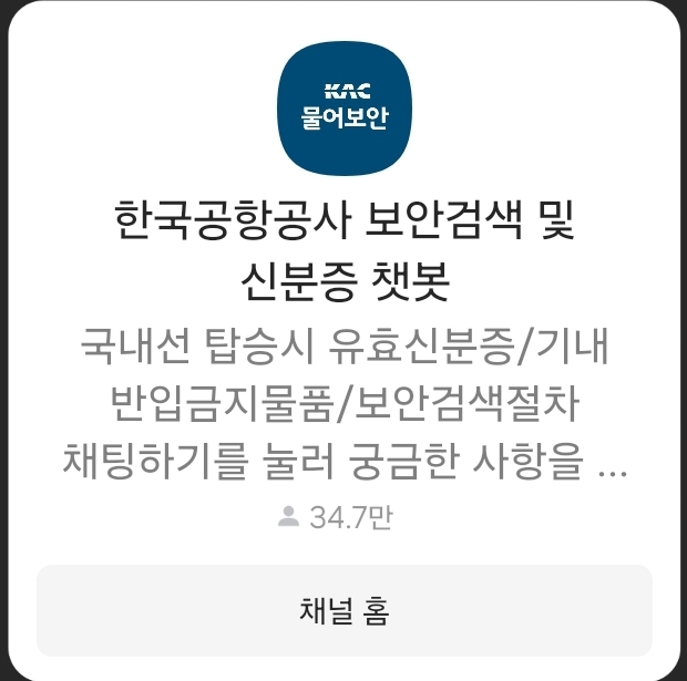기내 반입금지 물품을 확인하는 방법은 각 항공사별로 챗봇이나 고객센터를 통해서 확인할 수 있습니다. 그렇지만 조금 더 손쉽게 확인할 수 있는 편리한 방법 알려드릴게요. 바로 "한국공항공사"에서 제공하는 AI 카카오톡 문의채널 "물어보안"입니다. 문의사항에 대해 쉽고 자세하게 알아볼 수 있습니다.
